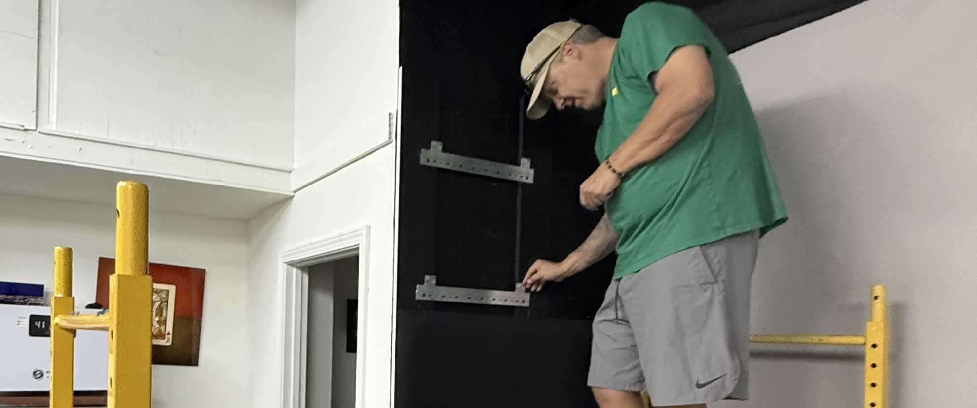 One of us was hanging cleats and placing panels on the wall, one was preparing z-clips and screwing them into the panels, one was marking locations of future drilling.