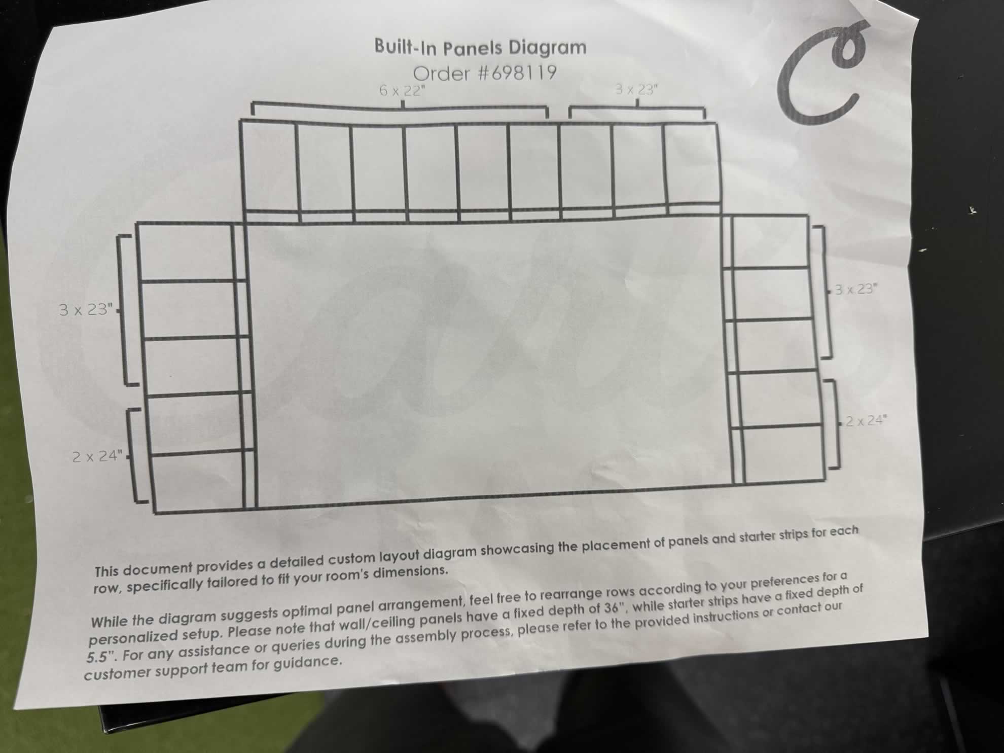 Use the included paper print-out of your room layout and how the panels are to be installed. Sort them on the ground and I recommend laying them out prior to hanging your first wall cleat.