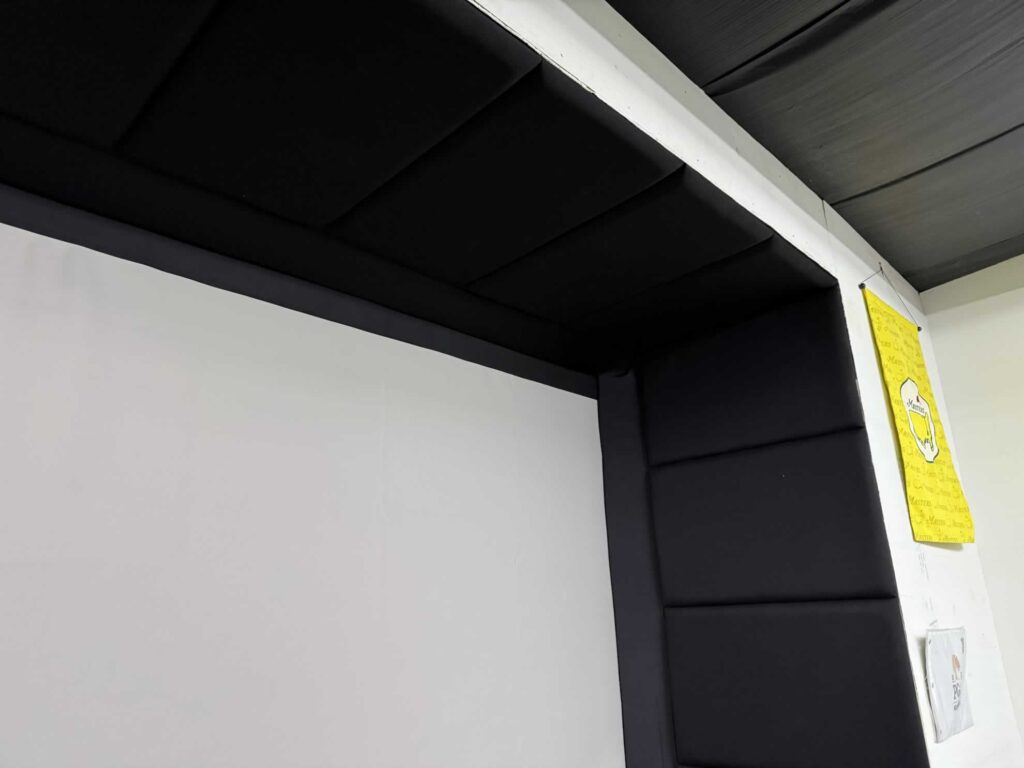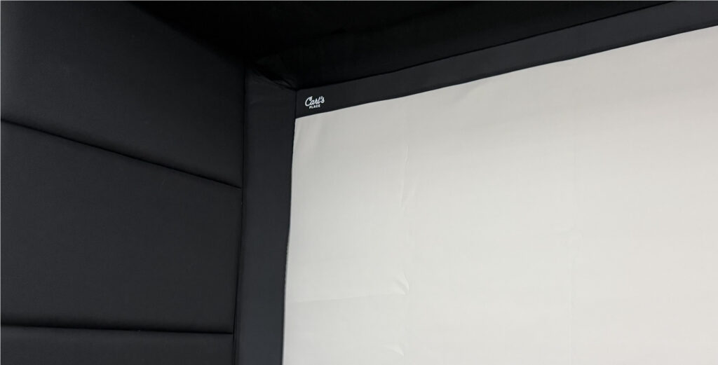 Hang the screen 26.5″ away from the back wall. Then use 6″ starter panels all the way around the screen (not the bottom). This is where the black flaps attach to and crucial for the setup, holding the foam padding inserts.